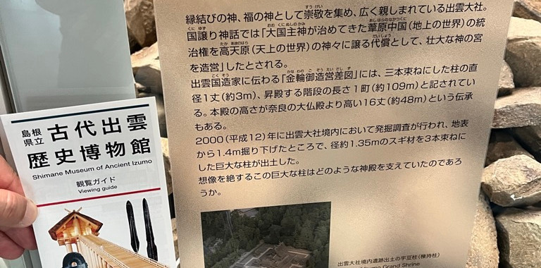 その後、まずは出雲大社の成り立ちを理解すべく古代出雲歴史博物館へ。前から知りたかった出雲大社の成り立ちを理解できた。祭神は大国主大神、最初の大社竣工は大和朝廷時代69-年と言われ、高さ48メートルの神殿は!!メートルの回廊の先にそびえ立っていたと言われる。日本の寺社の中で1位の高さであり、その次に東大寺、平安神宮があることから「」という言葉がある。その後何度も崩れ、焼け落ちて来たがその時々の権力者が立て直し、今の形が作られたのは江戸期の。